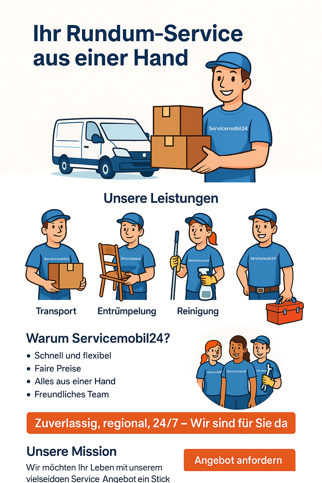 Wir sind Servicemobil24 – Ihr zuverlässiger Partner für Transporte, Entrümpelungen, Reinigungen und Hausmeisterdienste. Mit Erfahrung, Engagement und einem freundlichen Team sorgen wir für die perfekte Ausführung jedes Auftrags.